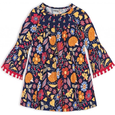 Bavlněné dívčí šaty s dlouhým rukávem. Rozšířený střih, vpředu nabrané. Na rukávech našitý volán s třásněmi. Příjemný úplet s výrazným barevným potiskem.