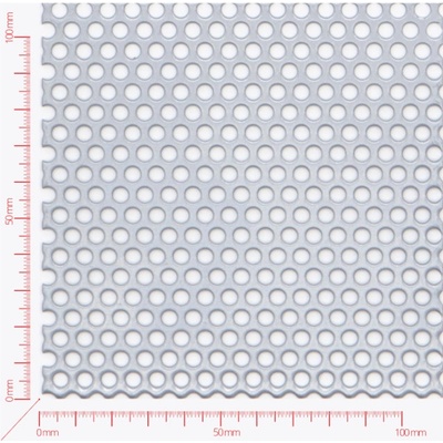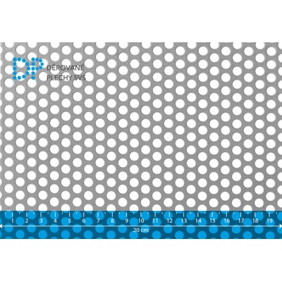 Děrovaný plech nerezový, kruhové přesazené děrování Rv 4-6 mm. Rozměr 1000x2000 mm. Tloušťka plechu 1 mm. Vyrobeno dle DIN 24 041. Jakost 1.4301. Hmotnost 9,56 kg. Volná plocha...