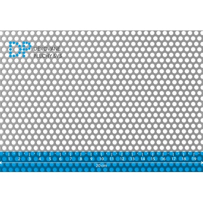 Děrovaný plech ocelový, kruhové přesazené děrování Rv 1-2 mm. Rozměr 1250x418 mm. Tloušťka plechu 1 mm. Vyrobeno dle DIN 24 041. Jakost DC01/DD11. Hmotnost 3,25 kg. Volná...