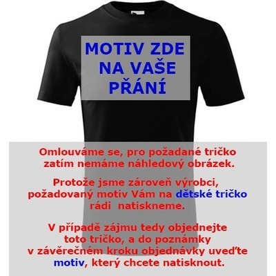 Černé dětské tričko s motivem na přání. nabízené velikosti jsou 4 roky, 6 let, 8 let, 10 let, 12 let. Výběr z 13ti barev. Tričko patří do kategorií . Technologie potisku: Tisk...