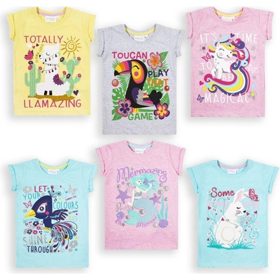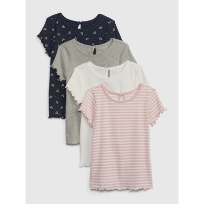 Dívčí trička z žebrovaného úpletu. V balení celkem 4 kusy. Různé barvy a vzory. Kulatý výstřih se zapínáním za krkem. Krátké rukávy zakončené vlnovkou. 100% bavlna.