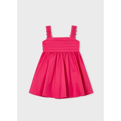 Mayoral dívčí šaty na ramínka v tmavě růžové barvě. Šaty mají krásná ozdobná ramínka. Zadní část šatů je krásně řešená. Zavazování na mašli dodává šatům šmrnc a možnost úpravy.