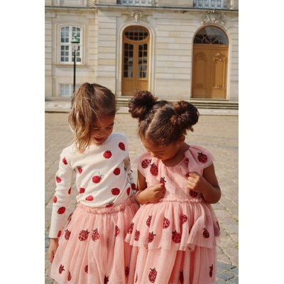 Nádherné tylové šaty s beruškami z flitrů. Šaty mají zapínání na zadní straně na perleťový knoflíček. Šaty jsou celé podšité bavlněnou podšívkou. Na tylu jsou lesklé odlesky.