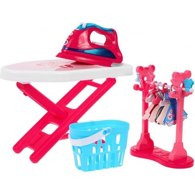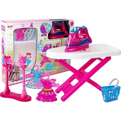 Plastové žehlící prkno s žehličkou, věšákem, ramínky a dalším příslušenstvím pro malé hospodyňky. Výška prkna 50 cm. Žehlička má zvukové a světelné efekty.