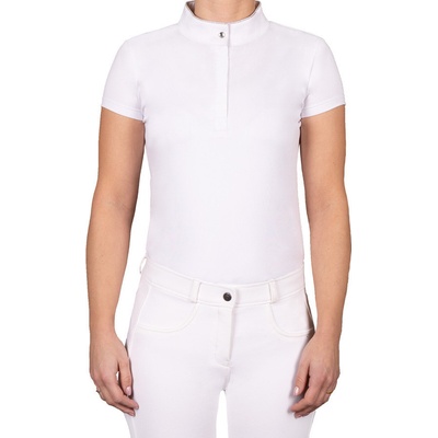 Závodní jezdecké triko s krátkým nebo dlouhým rukávem značky Horze. Stříbrný potisk na rukávech. U krku stojáček se zipem. Příjemný prodyšný materiál.