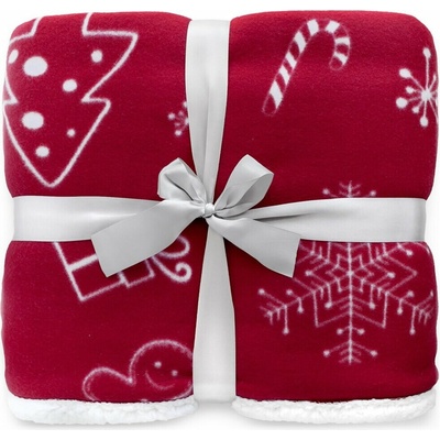 Vánoční deka s bílým potiskem stromků, dárků, baněk, perníčků a sobů na sytě červeném podkladu. Z jedné strany hebký materiál, z druhé huňatý povrch připomínající beránčí kůži....