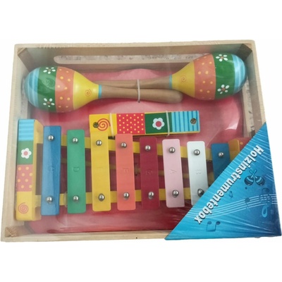 Dřevěná sada hudebních nástrojů: flétna-tamburína-xylofon-kastaněty Nádherný barevný hudební set pro malé hudebníky. Hudební set obsahuje xylofon, tamburínu, flétnu a kastaněty....