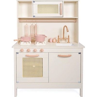 - velká dřevěná kuchyňka ideální pro hru více dětí najednou - kuchyňka je vybavena lednicí, mikrovlnkou, troubou, dřezem, 4 varnými plotýnkami a policí - otáčecí knoflíky u...