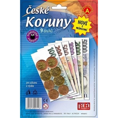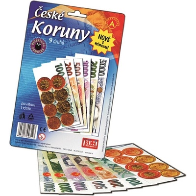 PEXI České koruny - dětské peníze do hry. Nyní nové - obsahují 9 druhů českých korun, včetně papírových mincí. Rozměr balení cca 15 x 23 x 2 cm (D x V x Š).