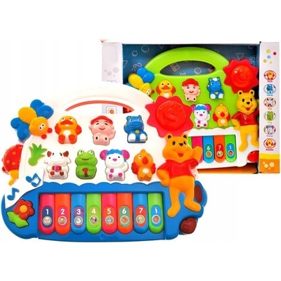 Dětské piánko i s mikrofonem, který se připojuje konektorem. Vhodné od 3+. Hraje jako piánko a dále je tam 5 zvířátek. Zvířátko po vložení do správného tvaru vydá zvuk. Kytička...