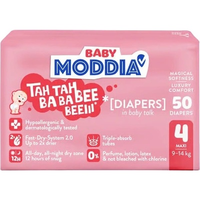 Moddia Baby Jednorázové plenky 4 Maxi (9–14 kg), 50 ks Jednorázové dětské plenky Moddia BABY ve velikosti 4 pro maximální pohodlí a ochranu vašeho dítěte. Rozlučte se s...