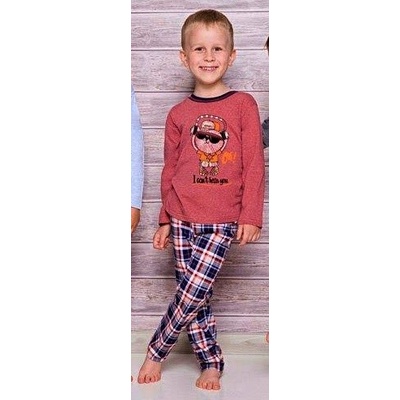 Chlapecké pyžamo má rovné kostkované kalhoty, triko kontrastní lemování kolem krku a je ozdobené potiskem....