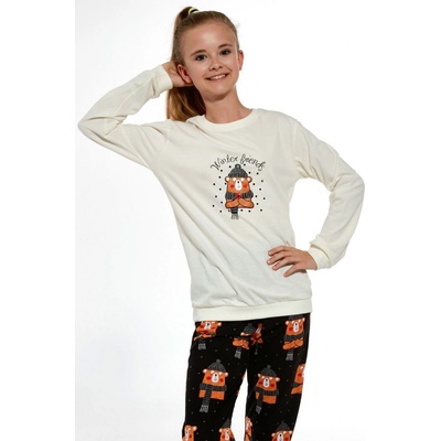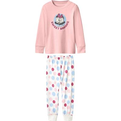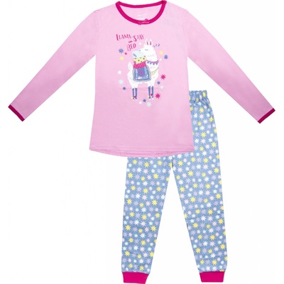 Dívčí pyžámko s dlouhým rukávem má tisk na předním dílu, rovné kalhoty jsou v barvě lemu u krku. Materiál: 100% bavlna