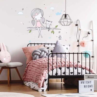 Roztomilá víla s kočičkou do holčičího pokojíčku. Samolepicí tapeta. Samolepka víly a kočičky v růžovém provedení do dětského pokojíčku. Krásné dekorace, jednoduché lepení,...