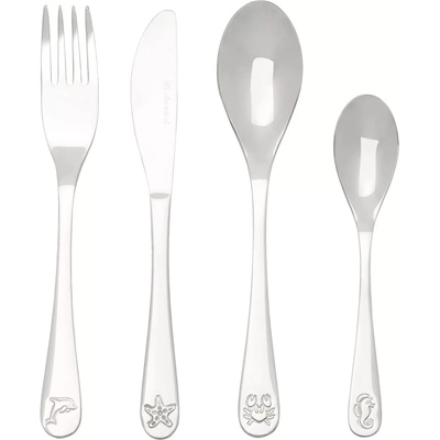 Okouzlující sada dětského příboru. Tento dětský příbor od renomované značky Zilverstad přináší hravé motivy mořských zvířat - delfína, mořského koníka, kraba a hvězdice -...