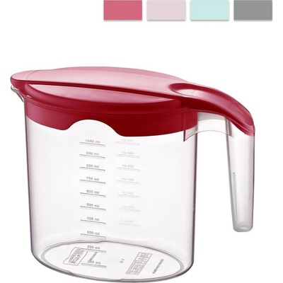 Džbán s víkem s výlevkou a s odměrkou. Materiál: plast. Víko ve 4 barevných provedení. Barva víka pouze na dotaz. Rozměry: objem 1 l, 20x10x15 cm.
