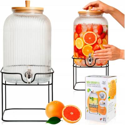 Sklenice 8 L na stojanu s plastovým kohoutkem, rýhovaná s bambusovým víčkem ✅ Silné ryhované sklo | Pohodlný kohoutek pro nalévání | Přírodní bambusové víko | ✨ Pevný kovový...