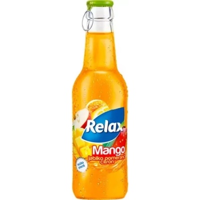 Nesycený ovocný nápoj z manga, jablka, pomeranče a citronu zčásti z koncentrátů. Pasterováno.