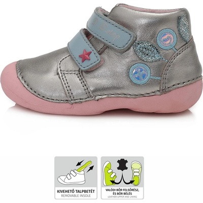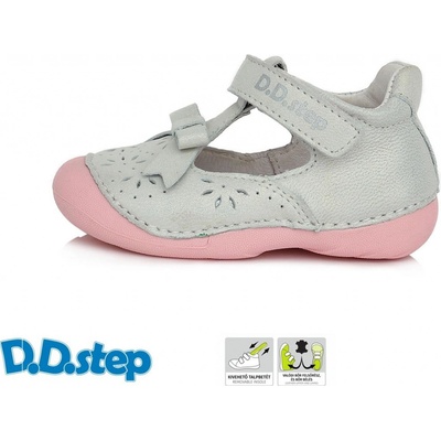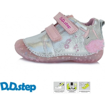 Dívčí obuv D.D. Step má svršek se stříbrným třpytem a pásky na suchý zip v růžové barvě. Samozřejmostí je celokožené provedení s měkkou stélkou, podešev je velice měkká,...