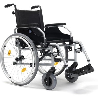 Základní mechanický vozík se sklopnými područkami a podnožkami, výškově nastavitelný sed, adaptér těžiště.