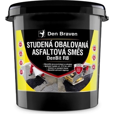 DEN BRAVEN Studená obalovaná asfaltová směs DenBit RB 25kg (kbelík)Hmota je vhodná pro opravy výtluků na komunikacích, opravy propadlých překopů silnic či kanalizačních vpustí, opravy mostů, parkovišť, průmyslových zón aj. Je určena pro aplikační teploty od -8 °C do...