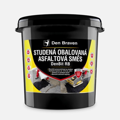 DEN BRAVEN Studená obalovaná asfaltová směs DenBit RB 25kg (kbelík)Hmota je vhodná pro opravy výtluků na komunikacích, opravy propadlých překopů silnic či kanalizačních vpustí,...