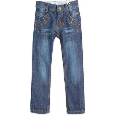 Chlapecké džíny z tmavě modrého denimu. Zapínání na zip a knoflík, v pase stahovací guma. Vpředu fuknční kapsy s ozdobnými detaily, vzadu kapsy falešné.
