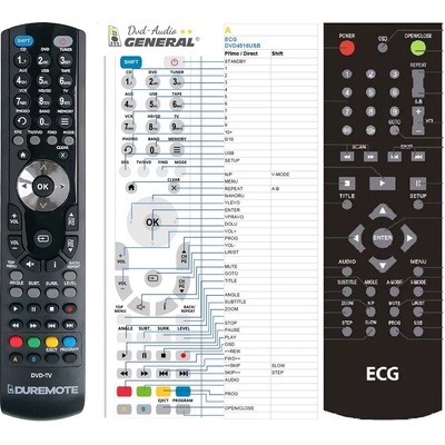 Náhradní dálkový ovladač ECG DVD2610USB, DVD3230, DVD4516USB - 100procent náhrada 1:1 za originální dálkový ovladač. Dálkový ovladač je určen pro tyto modely ECG: DVD2610USB,...