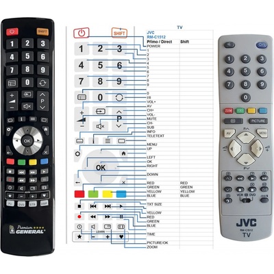Náhradní dálkový ovladač JVC RM-C1512, RM-C52 (RMC1512, RMC52) - 100% náhrada 1:1 za originální dálkový ovladač. Dálkový ovladač byl vyvinut speciálně na míru pro tyto modely...
