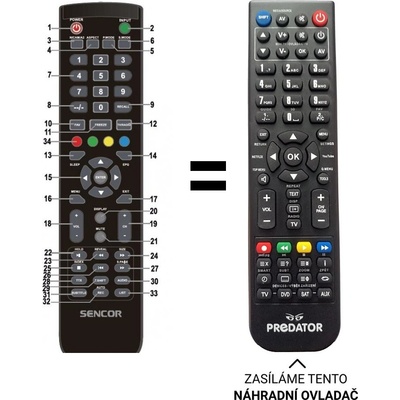 Ovladač je naprogramován přímo pro váš televizor Sencor. Ovladač má stejné funkce jako originál. Nemusí se nijak nastavovat. Po vložení baterií a stisknutí TV ihned funguje. Pro...