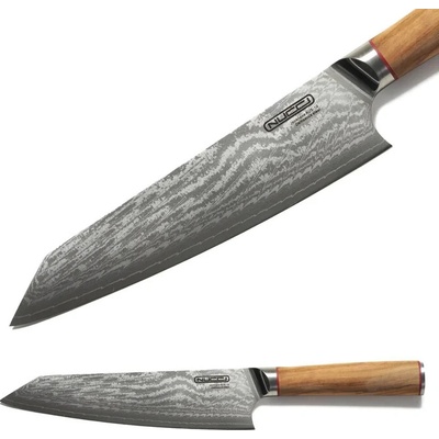 Výkonný japonský kuchyňský nůž s damaškovou čepelí a dřevěnou rukojetí — ostrý, vyvážený a připravený na domácí vaření.