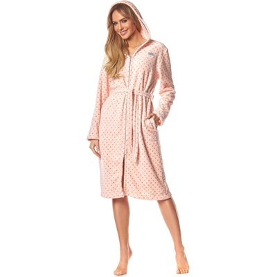 Komfortní, dlouhý župan. Je vyroben z měkké, hebké tkaniny, zdobí jej vzor malých puntíků. Velká kapuce je praktická a příjemná. Zapínání je řešeno zipem a v pase je i dodatečný...