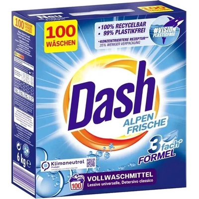 Dash Alpen Frische Universal prací prášek 100 PD Dash prací prášek je ideální prací prostředek pro rodiny. Díky své prací síle je extra silný proti skvrnám a je účinný již od 20°C. Bílé prádlo zůstane zářivě bílé a je aktivně chráněno proti zašednutí. Díky složení Dash...