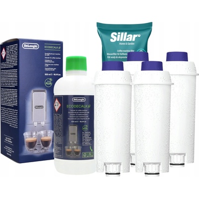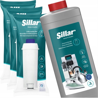 Sada Sillar pro kávovar Delonghi: 3 x filtr na vodu + odvápňovač 1 l ✅ Filtr vody Sillar pro kávovary DeLonghi se směsí aktivního uhlí a iontoměničové pryskyřice. Účinně...