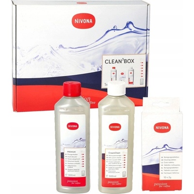 SadaCLEAN 3 BOX pro čištění kávovarů Nivona. Čisticí sada pro automatické kávovary obsahuje: - NIRK 703 - tekutý odstraňovač vodního kamene 500 ml - NIRT 701 - čistící...