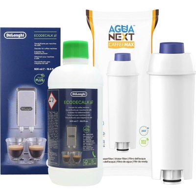 Filtrační vodní náplň AguaNext CaffeeMax pro kávovary DeLonghi + odvápňovač Delonghi Eco Decalk 500 ml Sada obsahuje: ▶ vodní filtr Agua Next – 4 kusy ▶ odvápňovač Delonghi...