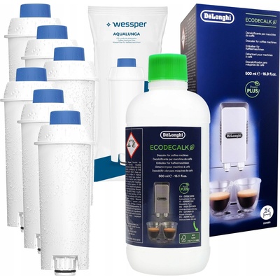 Sada pro kávovar Delonghi: 6 x vodní filtr Wessper AquaLunga + originální odvápňovač Delonghi 500 ml V balení: ✅ vodní filtr Wessper AquaLunga – 6 kusů ✅ Odvápňovač Delonghi...