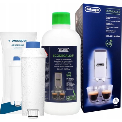 Sada pro kávovar Delonghi: vodní filtr Wessper AquaLunga + originální odvápňovač Delonghi 500 ml V balení: ✅ filtr na vodu Wessper AquaLunga - 1 kus ✅ Odvápňovač Delonghi...