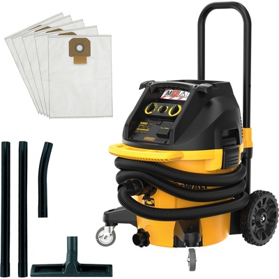 DeWALT DWV905MKIT-QS Inovovaný model vysavače s vyšší výkonem sání a větším průtokem vzduchu při zachování certifikace třídy prachu M. - Variabilní volič sání - Velká zadní kola s brzdou - Dvojitý filtr s automatickým čištěním - Odolná 3mm polypropylenová hlava a...
