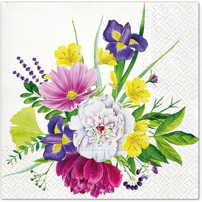 Třívrstvé papírové ubrousky s květinovým aranžmá. Elegantní doplněk pro sváteční stůl, svatbu či letní oslavu. Rozměry 30 x 30 cm.