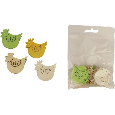 Sada dekoračních slepiček. Sada obsahuje 12 slepiček. Rozměry: 4 x 0,2 x 3,5 cm. Materiál: dřevo. Barva: zelená, žlutá, bílá, přírodní. Tento výrobek není hračka. Plastový obal odstraňte z dosahu dětí. Hrozí udušení.