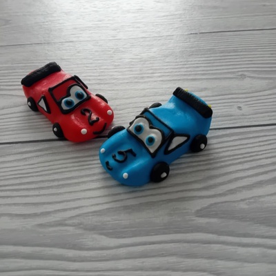 Motor nech běžet – tahle dortová dvojka je připravená na sladký závod století. Dekorace v podobě červeného a modrého autíčka z modelovací potahové hmoty jsou ideálním doplňkem...