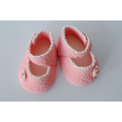Samostatná cukrová dekorace na dort ve tvaru dětských papuček. Barevné varianty: růžová. Cukrová dekorace dětské papučky na dort Samostatná cukrová dekorace ve tvaru dětských...