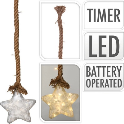 Osvětlení HVĚZDA LED 15 cm, skl. BÍ, na laně 95 cm, s časovačem. rozměr: 15 cm délka lana: 95 cm materiál: skleněná koule, přírodní lano včetně časovače 2 x AA baterie,...