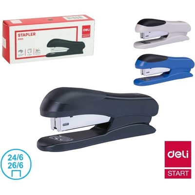 Sešívačka DELI E0305 - drátky č.24/6, 26/6 - sešití - 25 listů - 100 ks drátků - příjemné držení - ukazatel množství drátků v sešívačce - hloubka vkládání papíru 50 mm - otočná kovadlina - možnosti sešívání: otevřené, uzavřené, nastěnkové (takrování) - tělo z pevného...