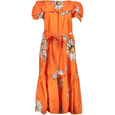 Midi šaty s krátkými rukávy s volánkem na vrchní části, odhalenými rameny, páskem a kopretinovým potiskem. Materiál100% bavlna