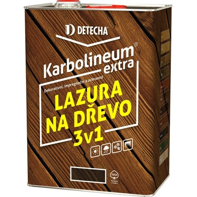 Přednosti Karbolineum Extra 3v1: - Prostě Karbolka - Hloubkové napouštědlo a zároveň vrchní nátěr. - Neuzavírá dřevo, nepraská, neloupe se. - Použité pigmenty zvýrazňují kresbu dřeva a zvyšují odolnost proti UV záření. - Po zaschnutí bez zápachu. - Snadná obnova...