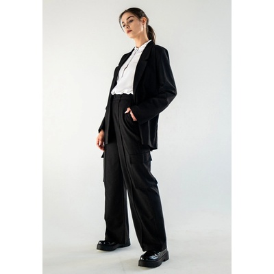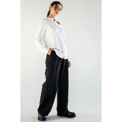 Černé široké kalhoty s prostornými kapsami se zapínáním na zip - volný střih, - široké nohy, - záhyb na nohou, - na zip, - prostorné kapsy našité po stranách nohavic, -...