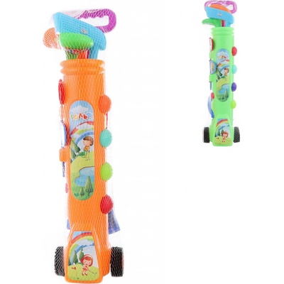 Dětský veselý barevný golfový set. Součástí lehký plastový vozík s obrázky, golfová hůl 3x, soft míček 4x, jamky, praporky a stojánky na míčky. 2 barevné varianty. Golf je...