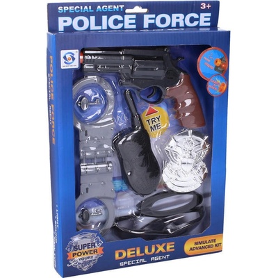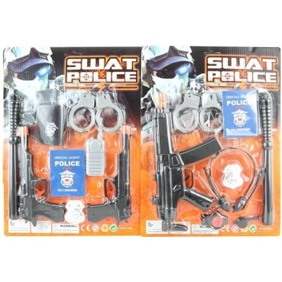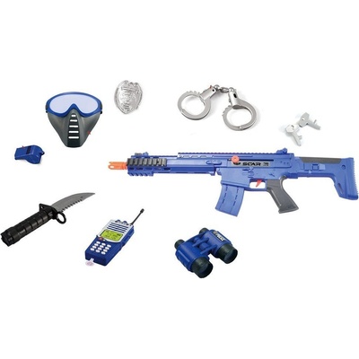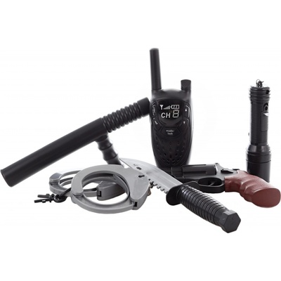 Policejní sada obsahuje pouta, průkaz, odznak, obušek a dále samopal, sluchátka, hodinky, píšťalku / 2 pistole, pouzdro, vysílačku.